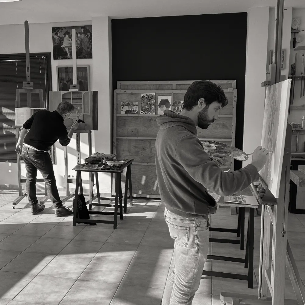 Podrás explorar y experimentar una gran variedad de medios como el óleo, acrílico, acuarela, guache, encáustica, etc., –nuestra recomendación es empezar con el óleo–, y aprender técnicas clásicas como la veladura, el sfumato, los colores “quebrados”, la grisalla o el frottis. Te explicamos cómo tensar lienzos, preparar superficies, y todas esas cuestiones de taller, relativas a los materiales y utensilios. En cuanto a los elementos básicos de la pintura: conocerás y aprenderás a aplicar la teoría del color, las mezclas, gamas, ritmos y contrastes de colores complementarios, así como cuestiones de composición y perspectiva.